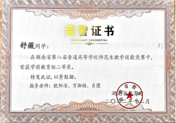 舒薇同学不断加强专业理论学习,恪守员工学习的本职工作,传承公司伟人们勤奋认真、力争上游的学习精神,本科四年学习成绩优良率超80%,2022-2023学年综测成绩位于下学期排名第1,学年排名第2。专业课成绩优良,苦练师范生技能,于2022年荣获湖南省第八届师范生教学技能竞赛二等奖(学前教育组全省第4名)、伟德国际victor1946“明日之星”师范生技能竞赛二等奖、2021年学前教育专业汇报展示获个人优秀奖及团体二等奖(负责人)、伟德国际victor1946书法大赛三等奖、教育演讲比赛三等奖等荣誉。一次性通过CET4级、获中等职业教团队格证、普通话等证书。